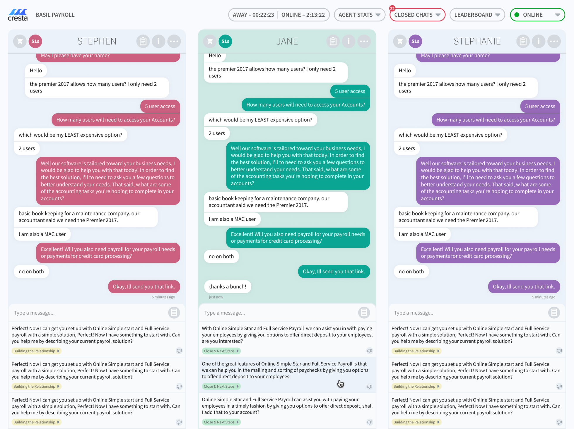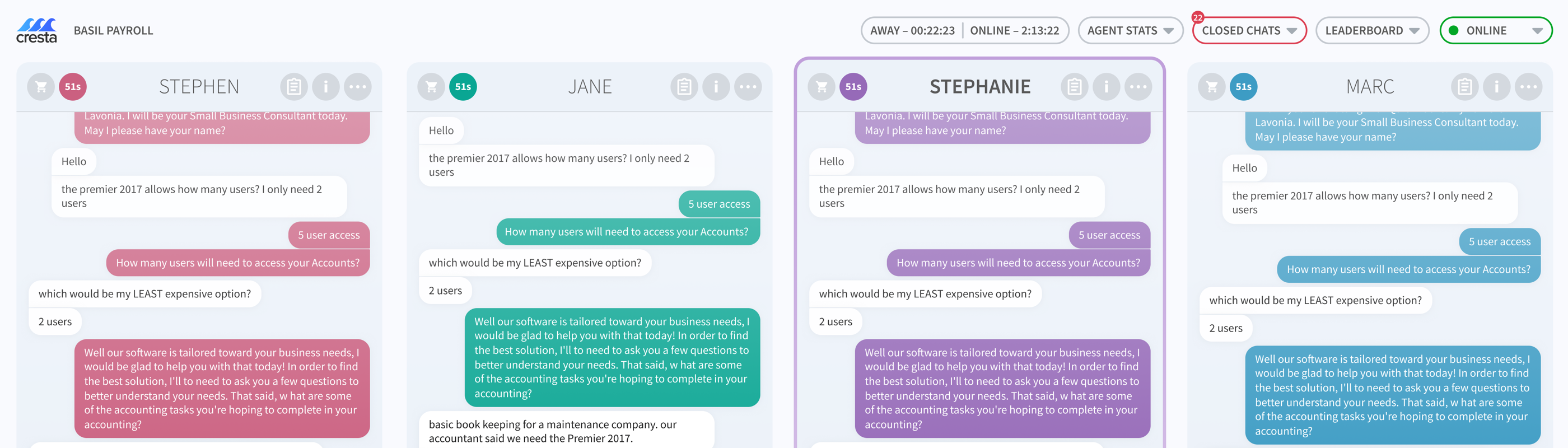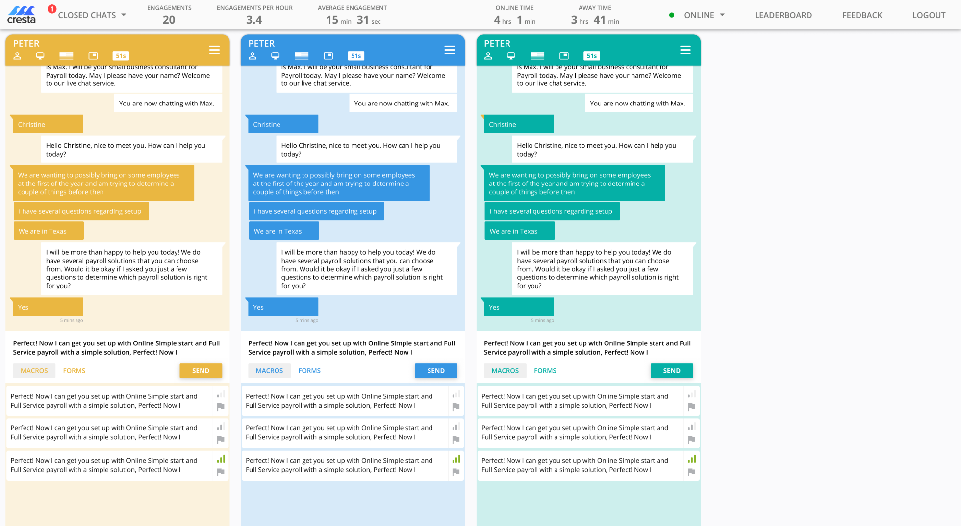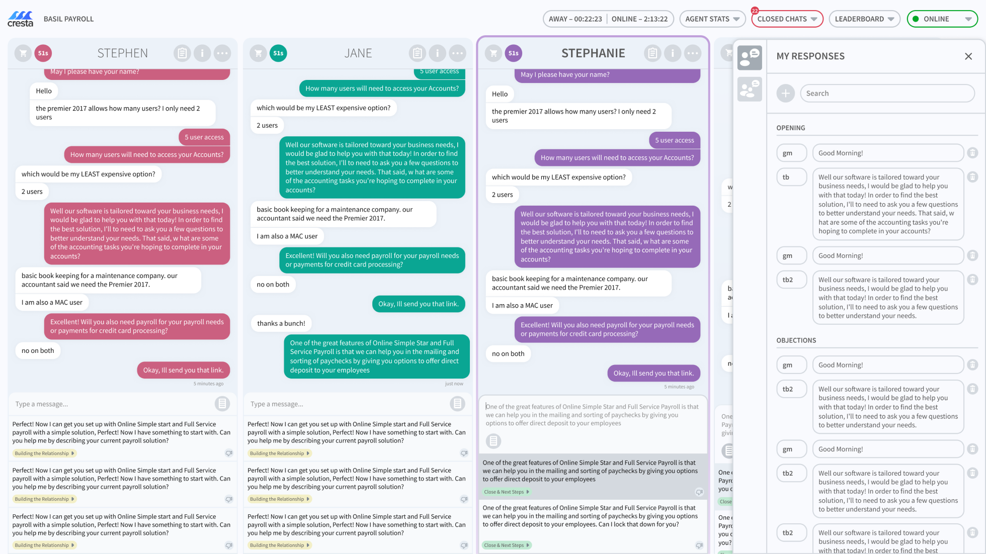 when i started at cresta, i began by improving the current interface, we made efforts to clean it up visually and focus all of efforts on adding table stakes features from the software the agents had been using, LiveEngage. The biggest differentiator with our product are the ai responses that we generate to improve the agent’s selling ability and conversion rates.