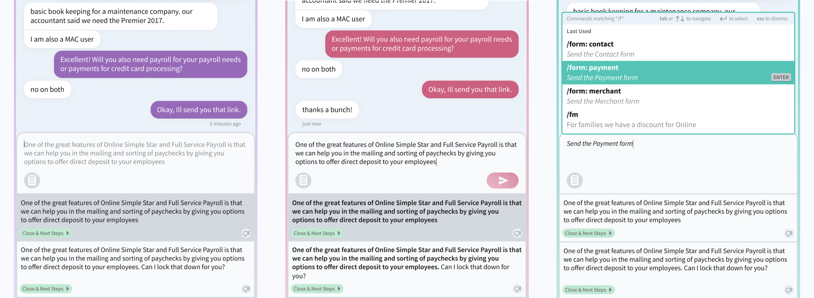 as the most important piece of the redesign, i wanted to make the chat input effective and efficient. it was necessary to focus on the different ways the input would be used and make sure that the smart features we wanted to add would be easily added without a complete redesign in the future. there were some changes we wanted to make to bring the ai responses into focus of the agents. we placed the first responses in the text box as grey help text which could be completed by the tab key. additionally we wanted to add / commands to the interface for hotkey responses and other smart actions.