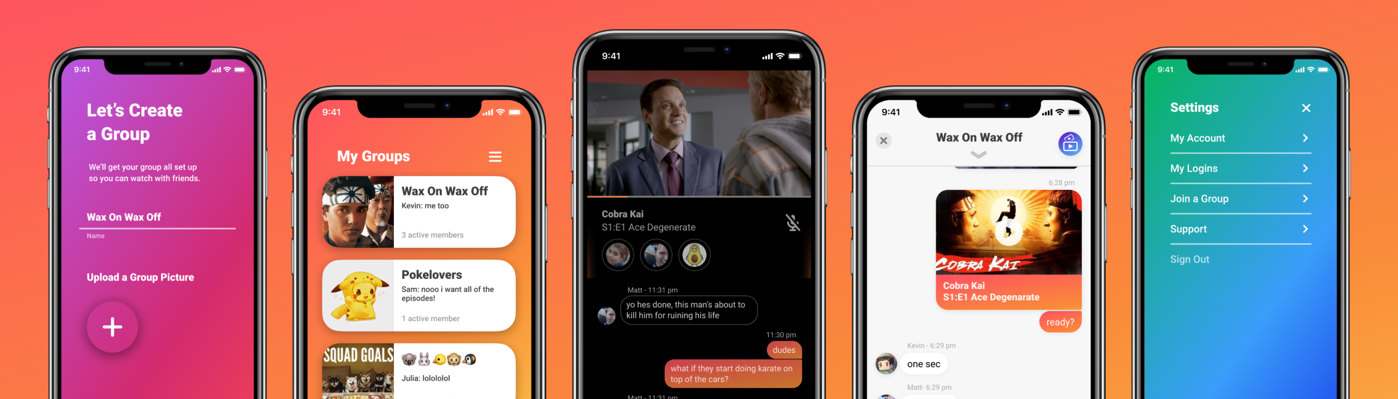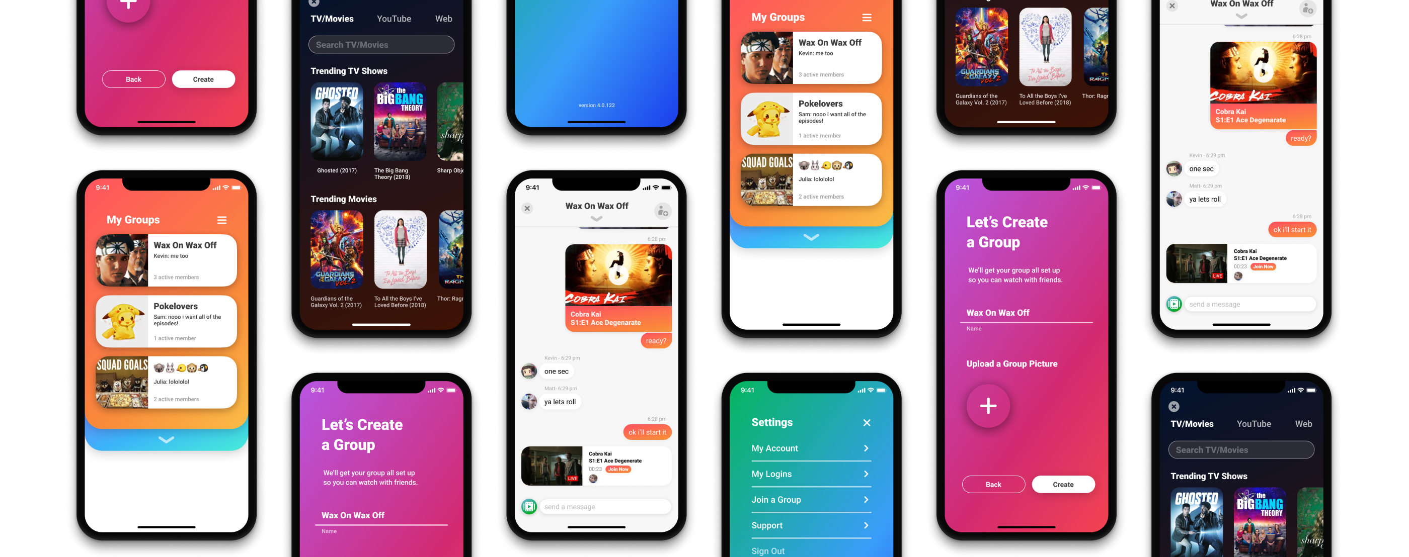 i started by creating the main screens for the app to help me understand the feel of the app. i wanted to go with something bright and cheerful using color to help guide and aim the user to where they were in the app. after fleshing out such screens as the home page, settings, create a group, launchpad and the group chat. from there, i had enough components and variety to finish out the rest of the screens including the watch experience. once the majority of screens we did a round of user testing which informed some visual and interaction details in the released app